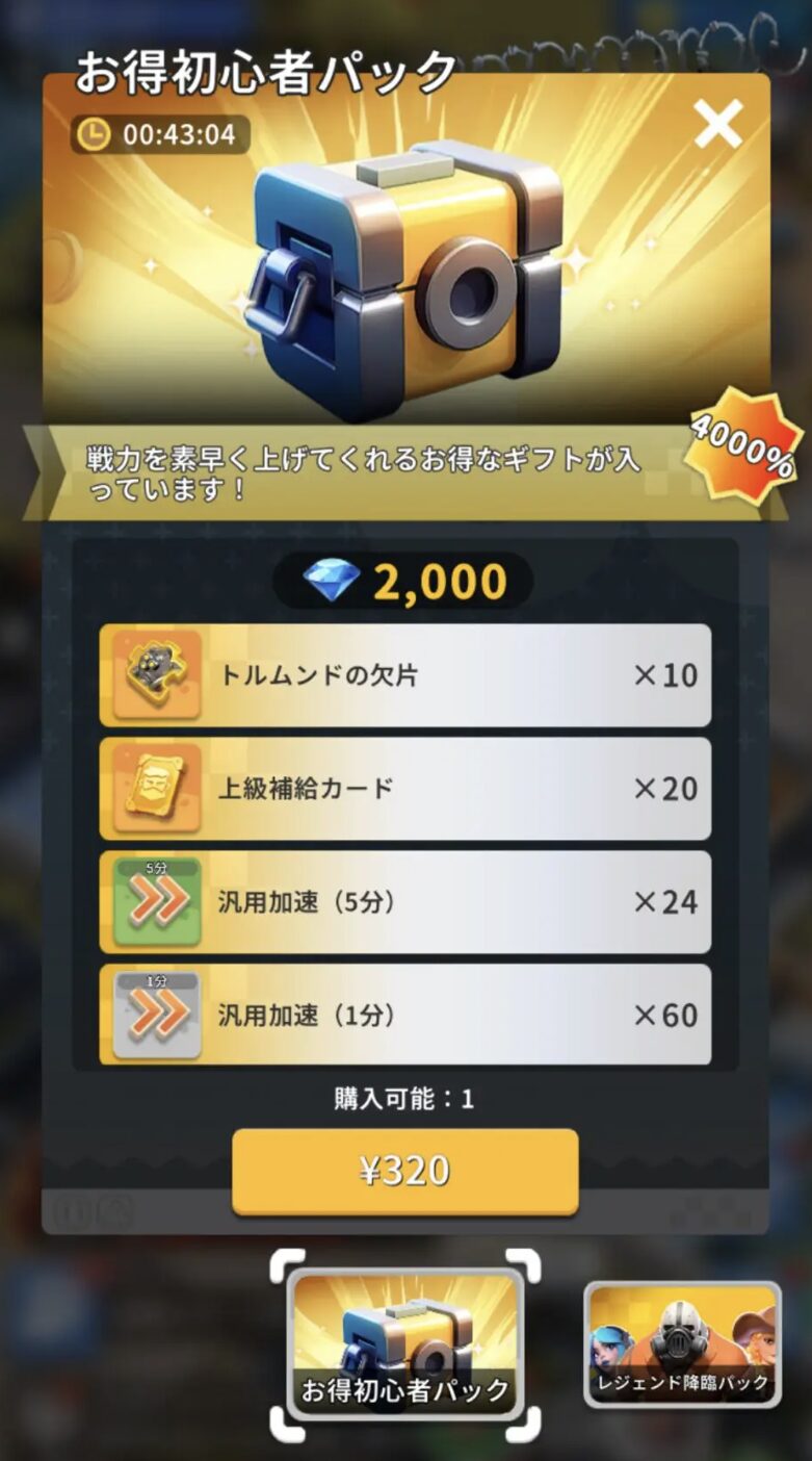 価格は320円で、ダイヤ2000個に加えてガチャアイテム×20や時間加速アイテムが大量にもらえるので序盤をスムーズに進められます。