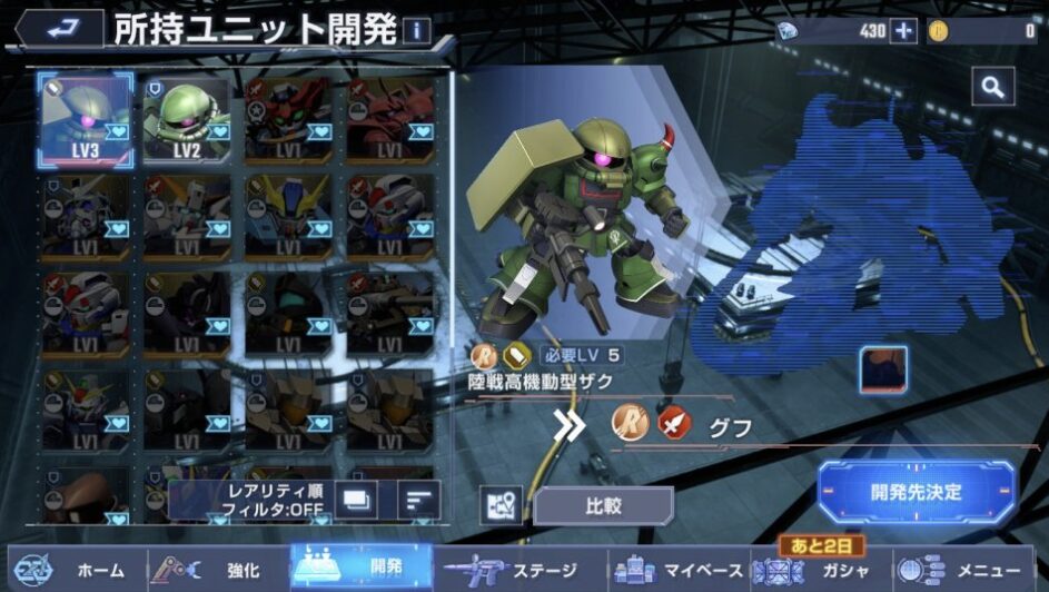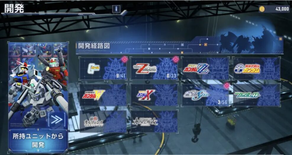 「開発」コンテンツでは、素材を使っていろんなガンダムを制作できます。