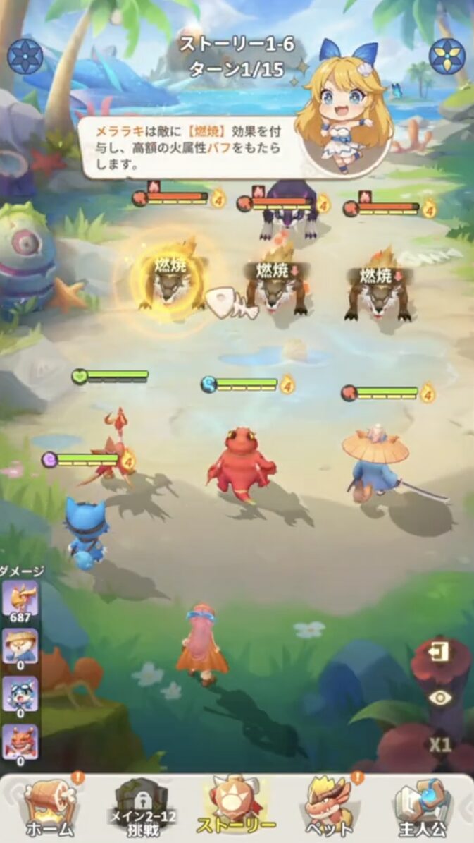 ゲーム内容は「ペットを6体編成→オートバトルを進行→世界を大冒険」といった感じです。