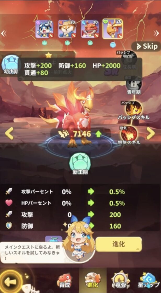 ストーリーのスキップ機能や育成周回の掃討機能もついています。